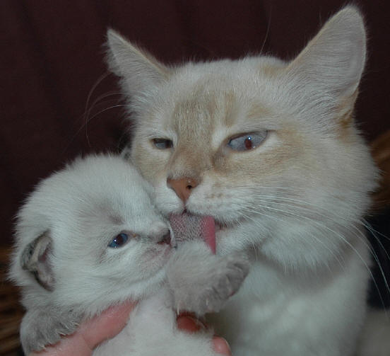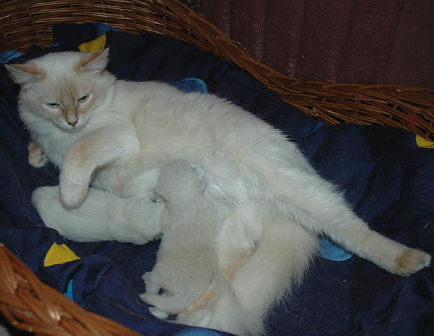 Mutter Antje of little Moscow cinnamon-tabby-point Vater FunnyFrank the Fabulous seal-point/white PRA-DNA-Testergebnis der Eltern: NN = negativ auf diese Mutation PK-Mangel-DNA-Testergebnis der Eltern: NN = negativ auf diese Mutation |