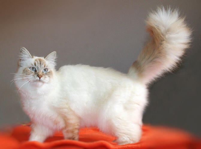 Angestrebt wird ein schöner deutlicher Kontrast von schoko-braunen und silbernen Streifen zur hellen Körperfärbung. Die Augen sind immer blau, je dunkler desto besser.
