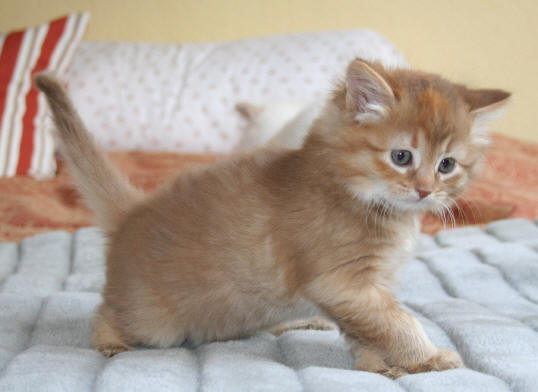 Katzen in späteren Generationen, die dem Typ der sibirischen Katze/Neva Masquarade entsprechen mußten im Alter von ca. 6 Monaten auf einer Ausstellung eine Rassebestimmung durch 2 Richter bestehen. Sie wurden der sibirischen Katze/Neva Masquarade zugeordnet und bekamen einen Experimental-Stammbaum. Bei den Trägertieren des Cinnamon-Gens legen wir vor allem Wert auf die Fellzeichnung und den Typ. Dabei geben wird den nicht-getickten Tieren den Vorzug. Bei den zimtfarbenen Tieren legen wir besonders wert auf die Qualität der Farbe. Die Einkreuzung von Somali soll eine einmalige Angelegenheit bleiben. Dieses Merkmal kann also später nicht mehr so einfach verbessert werden. Der Typ sollte natürlich auch hier weitgehend der sibirischen Katze/Neva Masquarade entsprechen, durch spätere Verpaarungen mit Rückkreuzungen und anderen Linien der sibirischen Katze, kann der Typ aber weiter stark verbessert werden. Diese züchterische Aufgabe haben wir ohnehin in dieser noch jungen Rasse zu leisten.